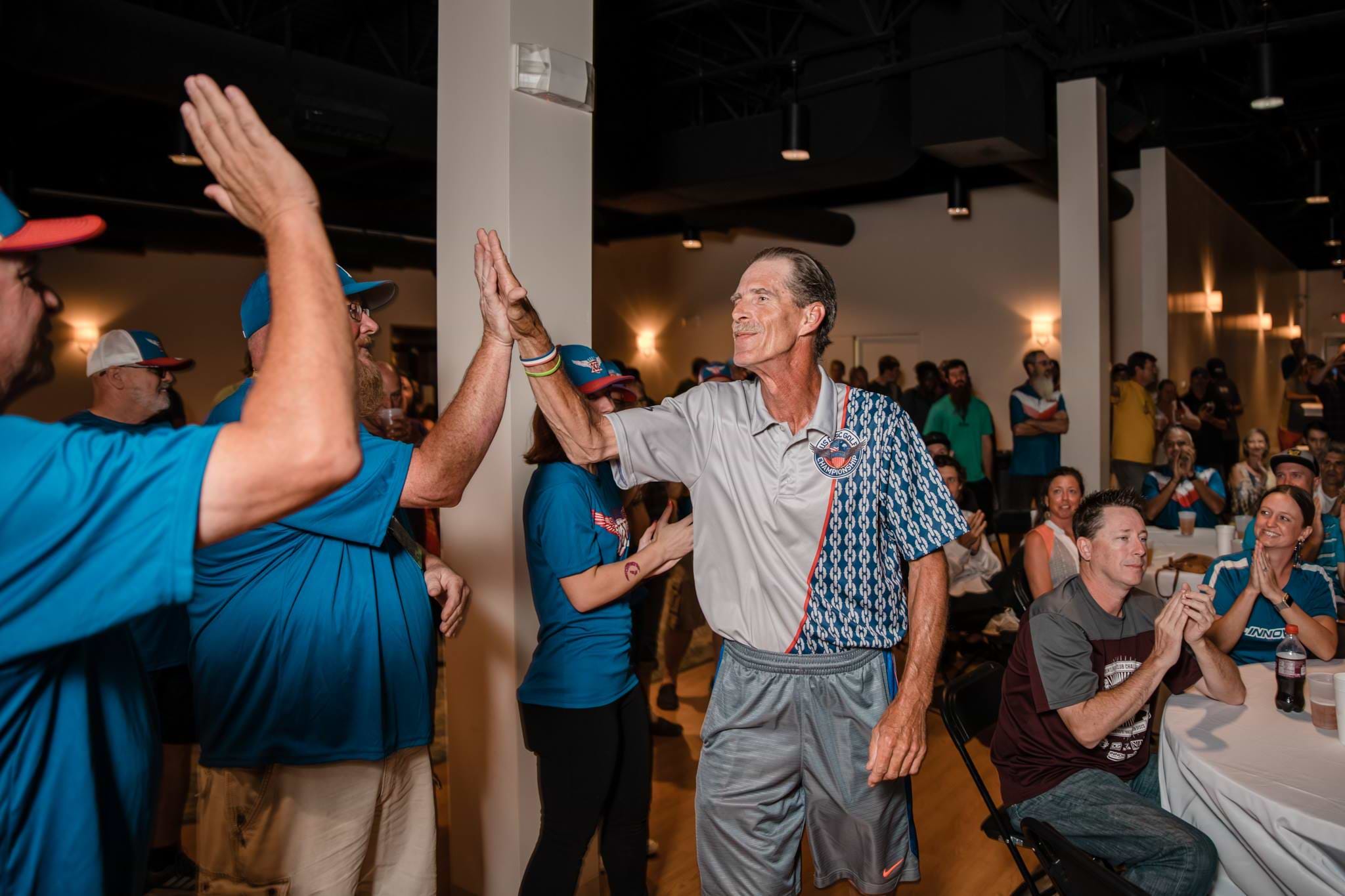 After USDGC Chairman Harold Duvall welcomed the players, Event Director Jonathan Poole started things off by bringing out all of the event’s staff and volunteers onto the stage, who were received with a rousing ovation by players situated at dining tables. It’s an annual gesture where the players get to see the many people dedicated to serving them during the week-long event.
